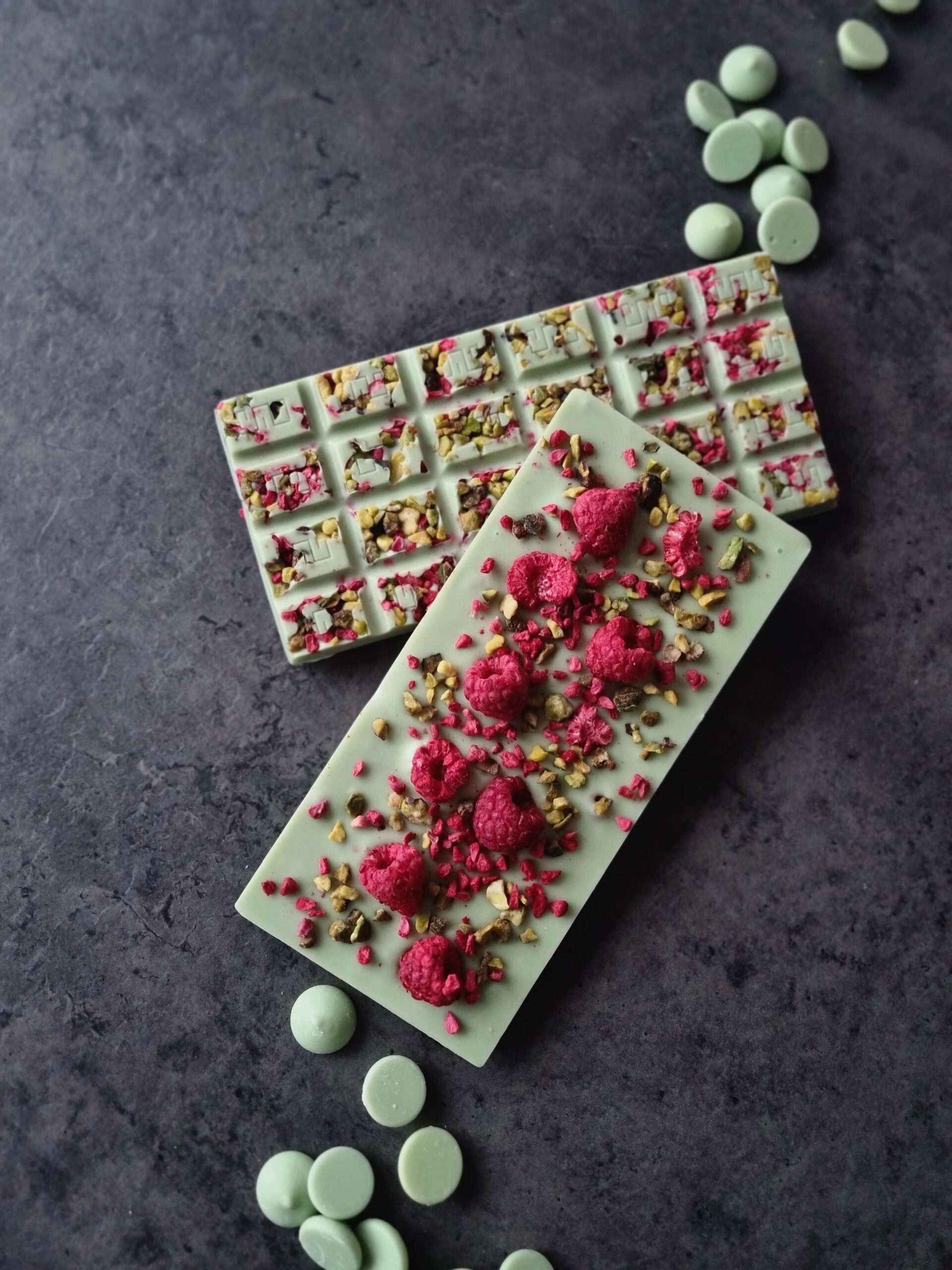 Sidrunimaitseline Belgia šokolaad vaarikatega ja pistaatsiapähklitega – värskus, krõmpsuvus ja peenus.
